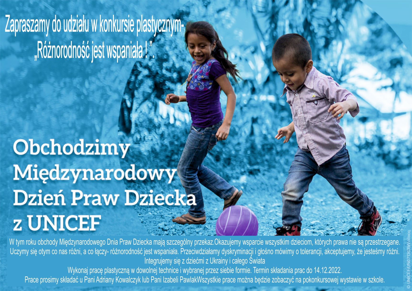 W tym roku obchody Międzynarodowego Dnia Praw Dziecka mają szczególny przekaz. Okazujemy wsparcie wszystkim dzieciom, których prawa nie są przestrzegane. Uczymy się o tym co nas różni, a co łączy- różnorodność jest wspaniała. Przeciwdziałamy dyskryminacji i głośno mówimy o tolerancji, akceptujemy, że jesteśmy różni. Integrujemy się z dziećmi z Ukrainy i całego Świata. Wykonaj pracę plastyczną w dowolnej technice i wybranej przez siebie formie.
