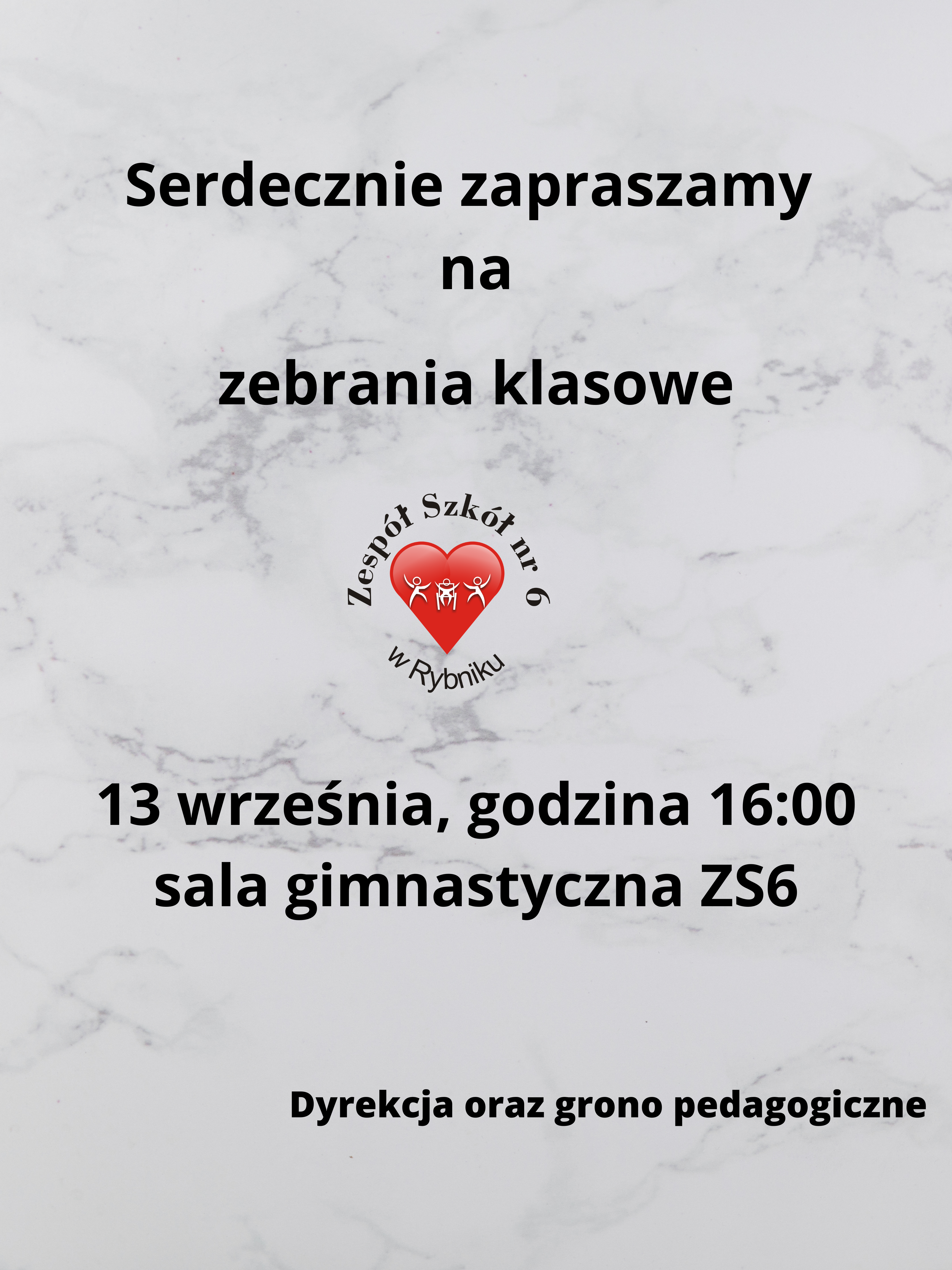 Serdecznie zapraszamy Państwa na pierwsze w tym roku zebrania klasowe, które odbędą się 13 września o godzinie 16:00 (sala gimnastyczna ZS6).